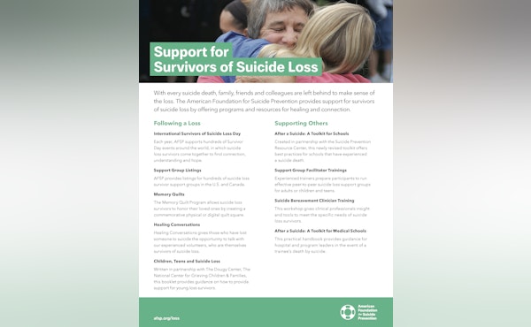 The Support for Survivors of Suicide Loss Flyer provides a brief but clear roundup of the different types of support offered to suicide loss survivors by AFSP’s Loss & Healing team.