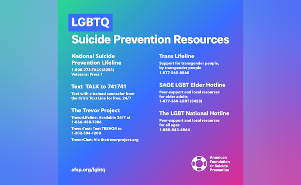 AFSP is focused on sharing and expanding suicide prevention strategies, programs, research initiatives, and public policies to prevent suicide in LGBTQ communities and supporting the mental health and wellbeing of LGBTQ people.
