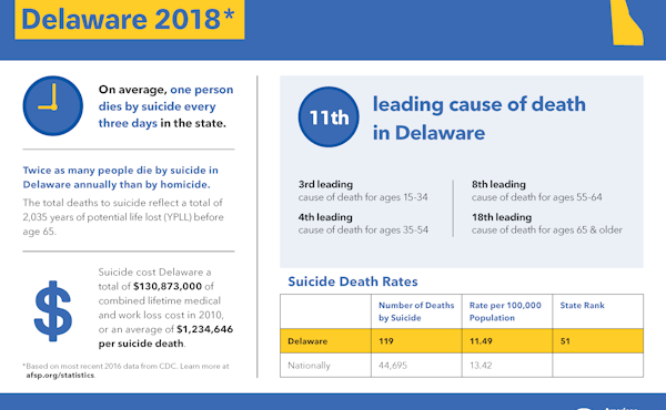 Suicide is the tenth leading cause of death in the United States and the eleventh leading cause of death in Delaware.