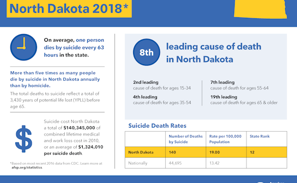 Suicide is the tenth leading cause of death in the United States, and it is the eighth leading cause of death in North Dakota.