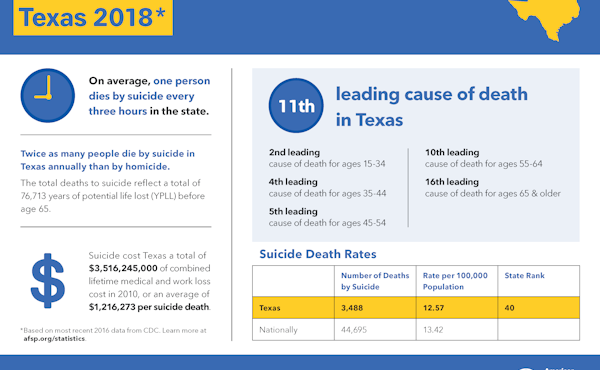 Suicide is the tenth leading cause of death in the United States and the eleventh leading cause of death in Texas.