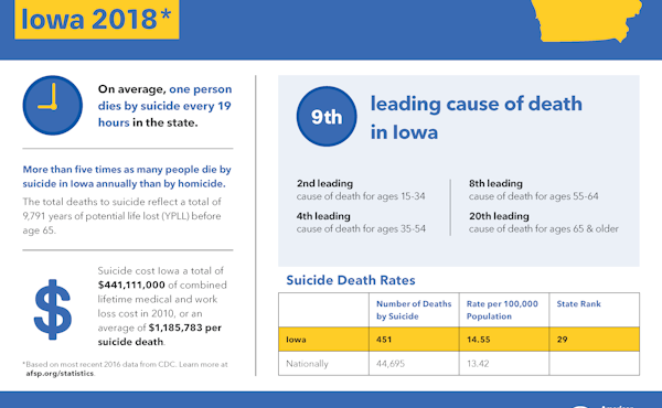 Suicide is the tenth leading cause of death in the United States, and it is the ninth leading cause of death in Iowa.