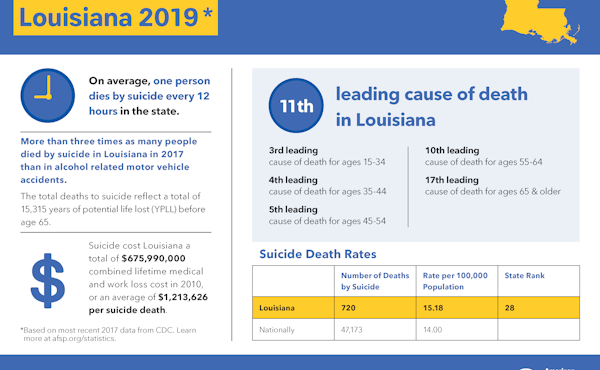 Suicide is the tenth leading cause of death in the United States, and it is the eleventh leading cause of death in Louisiana.