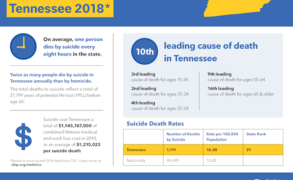 Suicide is the tenth leading cause of death in the United States, and it is the ninth leading cause of death in Tennessee.
